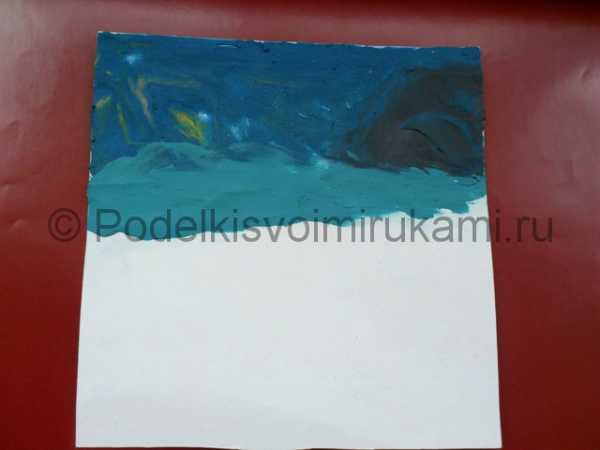 Смешав синий пластилин с небольшой частичкой жёлтого и хаотично распределив массу по поверхности картона, её тонким слоем размазывают по ней, не доходя конца листа примерно на три четверти. Жёлтые вкрапления размещаются таким образом, чтобы они имитировали проблески солнечных лучей.