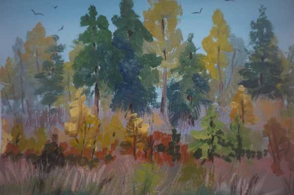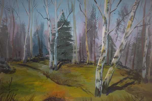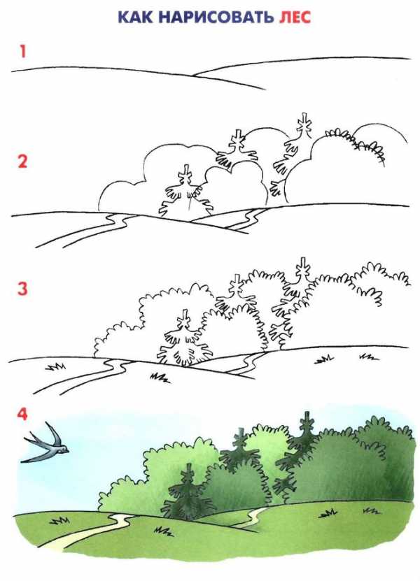 Можно для начала поучиться рисовать отдельно деревья, и потом уже воссоединить различные деревья в единый рисунок. Вот например, поэтапное рисование берзы: