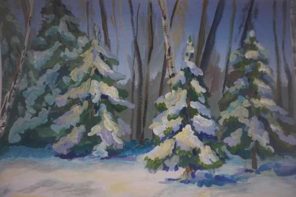 4. Теперь по наброску выполним рисунок красками. Елки будут сочно-зеленого оттенка, домики будут отдавать теплым оттенком некрашеного дерева, а снег будет чуть отливать голубизной. Чтобы картина смотрелась живой, усадим на забор трех птичек.