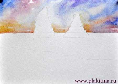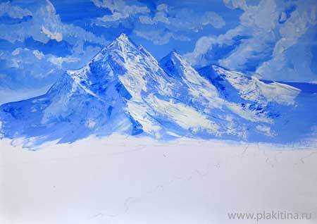 Далее спускаемся на горы. Смешав гуашь из белой и синей, с добавлением фиолетового, разукрашиваем склоны гор.