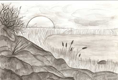 Если вы никогда не рисовали пейзаж, то пугаться не стоит. Его можно нарисовать очень простым способом. Берем лист бумаги и делаем прямую линию в левом углу, например. Это у нас будет основа часть пейзажа. Дальше проводим прямую линию, которая будет основой для горизонта. Эта линию должна располагаться так – лист делим примерно на три равных части. И в верхней части как раз линию горизонта и рисуем. Смотрите, что у нас получилось – горизонт, земля и небольшая горка. Теперь прорисовываем. Чтобы уголок превратился в горку, рисуем валуны. Просто плавными линиями рисуем камни. Здесь же можно обозначить травку, кусты. Придумайте сами свой пейзаж. Дальше, где линия горизонта, рисуем солнце. Только, конечно не полностью, а лишь его часть. А вот в центральной части рисунка можно нарисовать часть реки или даже небольшое озерцо. На берегу можно нарисовать камыш. Облачка так же прекрасно впишутся в рисунок. Смотрите сами, как рисовать.