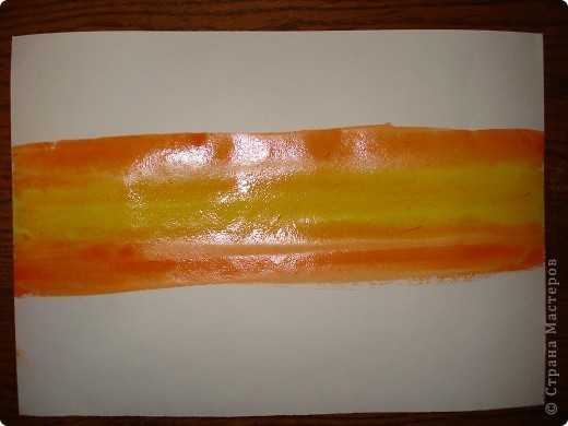 1.Найдм середину листа – это будет линия горизонта, которая разделит рисунок на небо и море. ПО линии горизонта жлтой краской рисуем широкую линию.