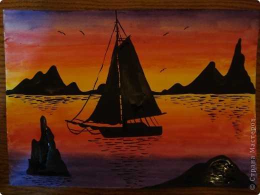 8.Можно морской пейзаж дополнить контуром корабля, опять же, чрной краской.