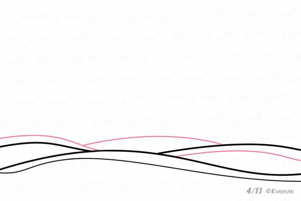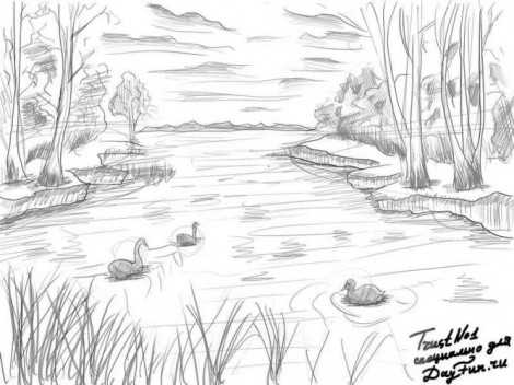 Шаг четвертый. Теперь нарисуйте небольшие волны и тени на воде, траву сделайте гуще, а задний фонт заштрихуйте.