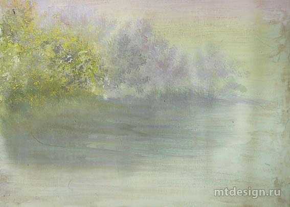правый берег реки рисуем таким же образом: деревья вдали потемнее, кустарники впереди более яркими – желтыми: