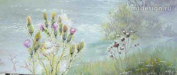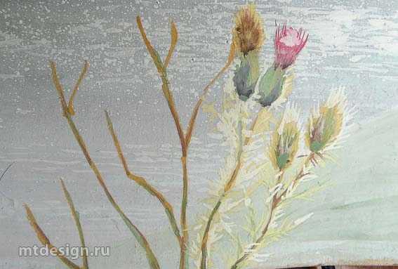 сделаем репейник пушистым, подальше нарисуем засохшую ветку и мелкие цветочки: