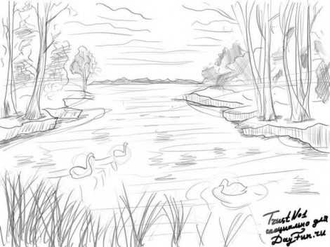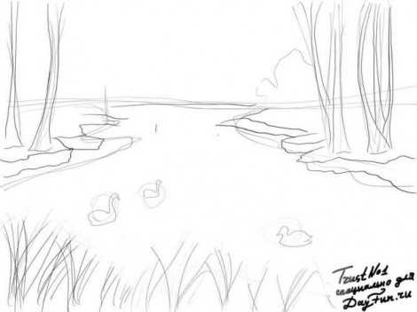 Шаг первый. Сразу выделяем линиями небольшой пруд с берегами, на берегах такими же линиями нарисуем несколько деревьев. Несколько кружков в воде послужат для превращения в уток.