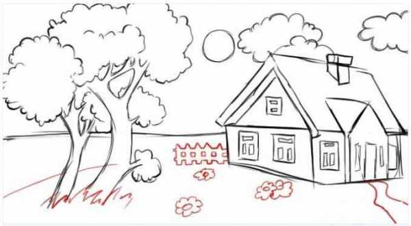 9. От домика прорисовывается заборчик, а под ним штрихами делается трава. Также можно нарисовать незамысловатые цветочки. Напоследок можно нарисовать тропинку к дому и еще какие-нибудь детали, которые приятно будет изобразить.