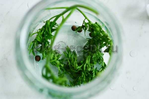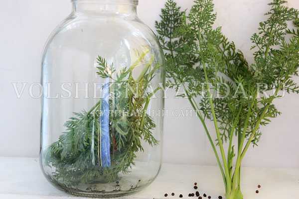 На дно банок я закладываю черный перец горошек и ботву — те самые зеленые хвостики, которые обычно выбрасываются при чистке моркови, понадобятся только «пушистые» веточки, без жестких стебельков. Слишком много ботвы не добавляйте, достаточно 2 штук на каждый литр, то есть 6 веточек на 3-литровую банку. Никаких других специй добавлять не нужно.