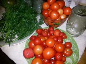 Я использую свои доморощенные помидоры. Конечно зреют они у меня не на грядке, снимаем мы их зелеными. Но когда они начинают поспевать, я отбираю маленькие экземпляры и начинаю потихоньку их делать. Вот сегодня я их насобирала на одну двухлитровую и три литровых банки. Обычно за сезон я стараюсь приготовить их таком исполнении литров 15.