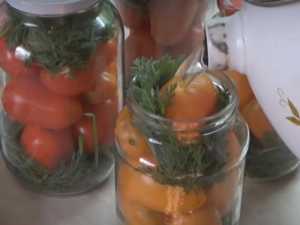 Для приготовления консервированных или маринованных томатов используют небольшие помидоры красного, желтого, оранжевого цвета. Они должны быть плотными, мясистыми. Плоды промывают, удаляют плодоножки, прокалывают иголкой, зубочисткой или острым кончиком ножа в районе крепления плодоножки. Это необходимо делать по двум причинам. Во-первых, проколотые плоды не лопаются. Во-вторых, при заливке они быстрее пропитываются рассолом.