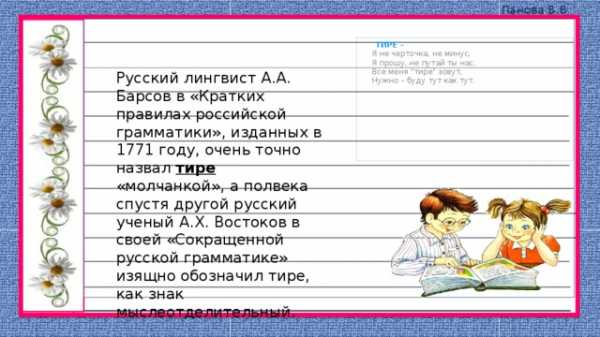 Русский лингвист А.А. Барсов в «Кратких правилах российской грамматики», изданных в 1771 году, очень точно назвал тире «молчанкой», а полвека спустя другой русский ученый А.Х. Востоков в своей «Сокращенной русской грамматике» изящно обозначил тире, как знак мыслеотделительный.