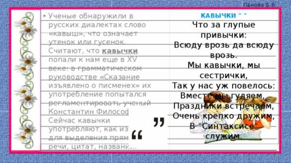 КАВЫЧКИ ” “ Что за глупые привычки: Всюду врозь да всюду врозь. Мы кавычки, мы сестрички, Так у нас уж повелось: Вместе мы гуляем, Праздники встречаем, Очень крепко дружим, В “Синтаксисе” служим.