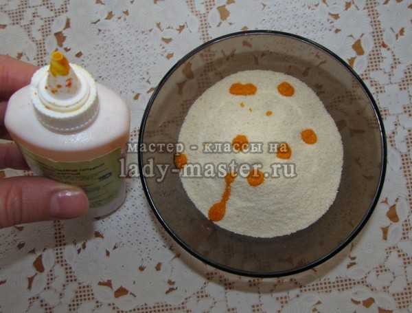 1. Для начала необходимо изготовить пыльцу для ромашек. Нам ее заменит окрашенная в желтый цвет манка. Капните в крупу около 10 капель пищевого красителя и хорошо разотрите массу ложкой или пальцами.