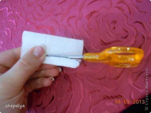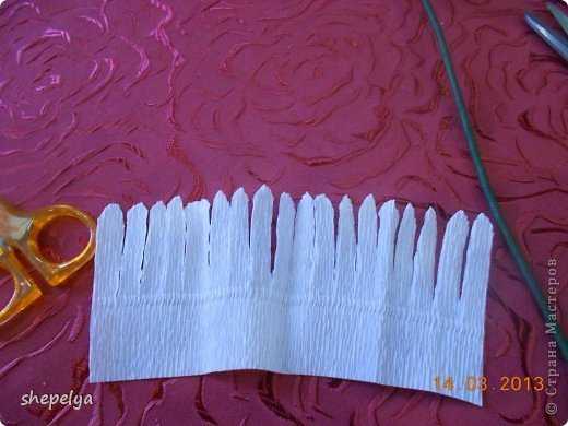 От трубочки креповой бумаги отрежем 7 – 8 см, отрез развернем полностью и разрежем на 4 части – должно получиться 4 цветка.