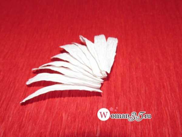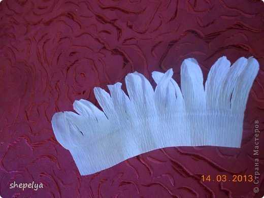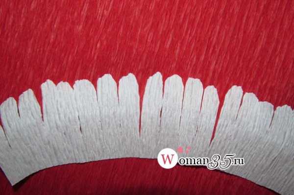 3. Из белой гофрированной бумаги вырежьте прямоугольник размером 5 см на 30 см. Обратите внимание: режьте бумагу именно так, как это показано на фото, линии тиснения должны быть вертикальными.