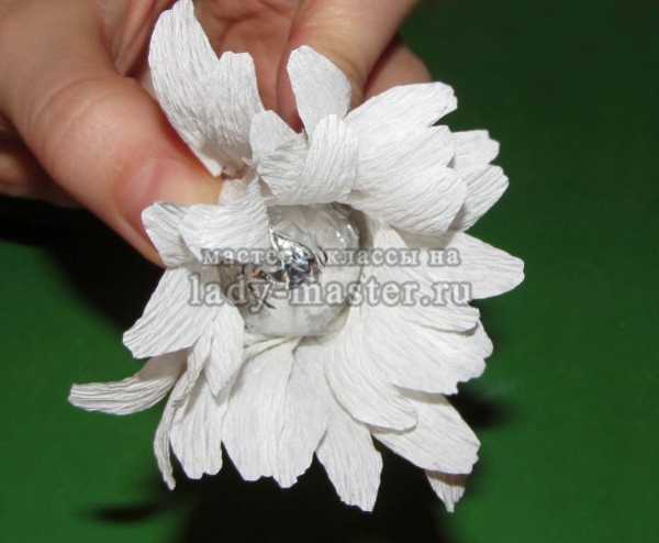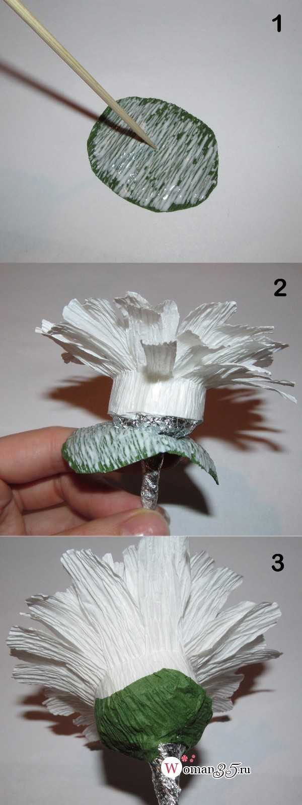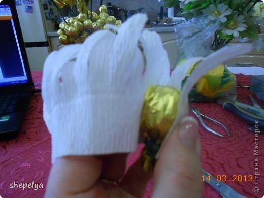 Из белой бумаги вырезаем лепестки и приклеиваем вокруг конфеты, не забываем про листики, которые делаем из зеленой гофрированной бумаги.