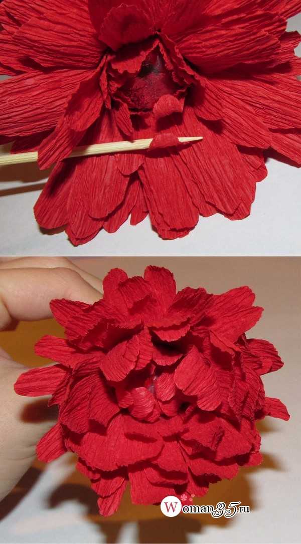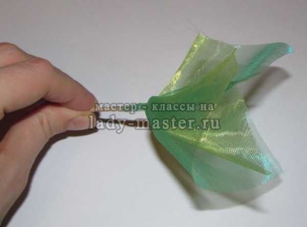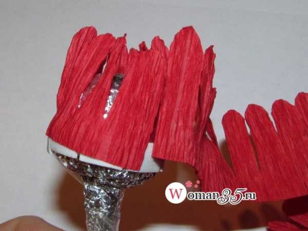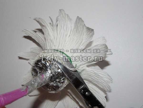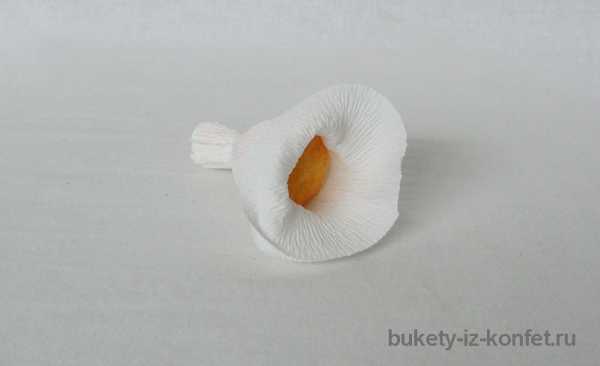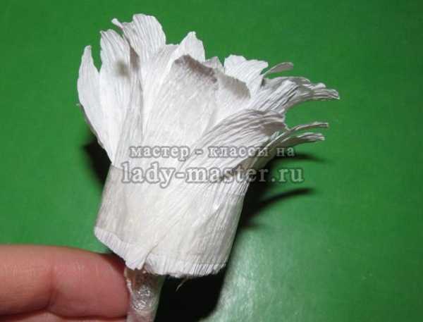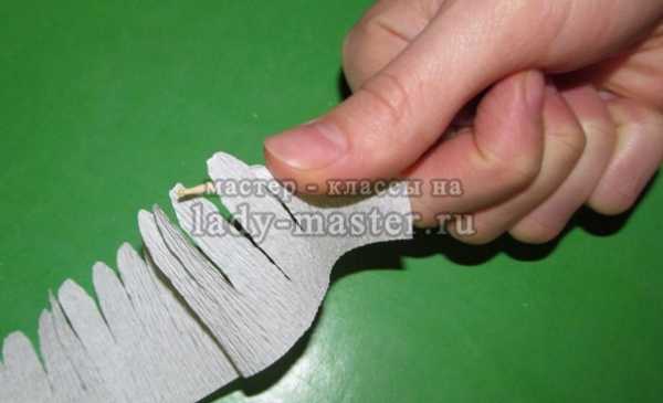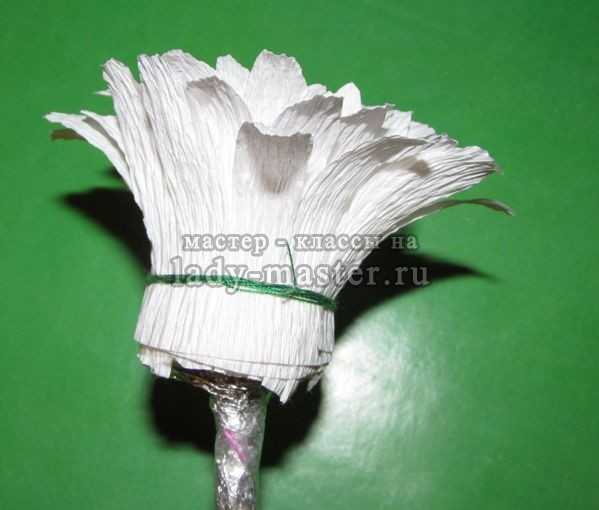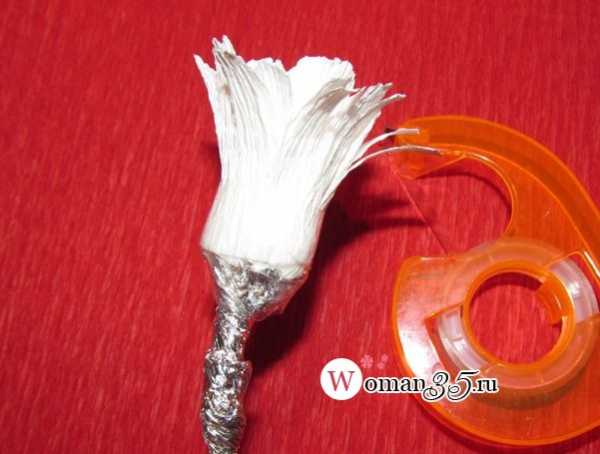 Займемся изготовлением цветов. Прикрепим бумажную заготовку из лепестков к шпажке. Для этого приложим один ее конец к шпажке и, вращая ее, делаем небольшие складки. Закрепим проволокой, расправим лепестки.