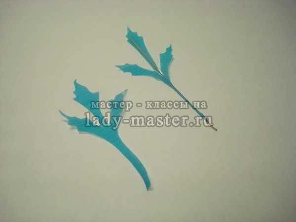 24. Теперь нужно изготовить листья для букета. Для этого из зеленой гофрированной бумаги вырежьте несколько заготовок так, как показано на фото ниже.