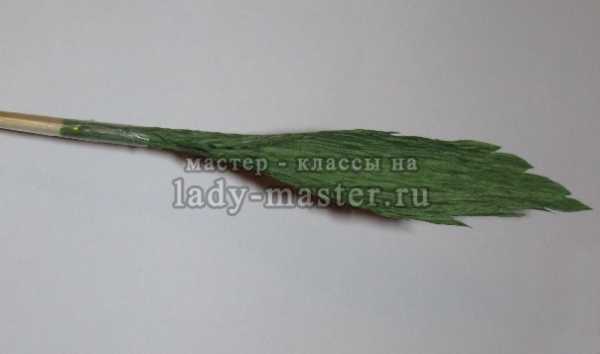 27. Чуть ниже приклейте еще два листика. Затем шпажку обклейте зеленой полоской бумаги.