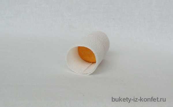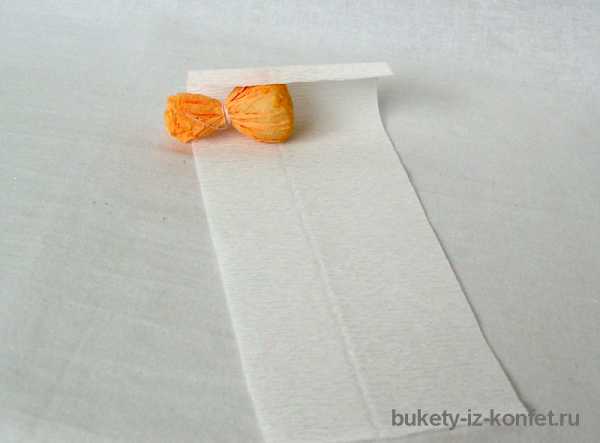 14. Возьмите заготовку с лепестками, но уже обычную, не сложенную гармошкой. Оберните ею основание конфеты 2–3 раза.