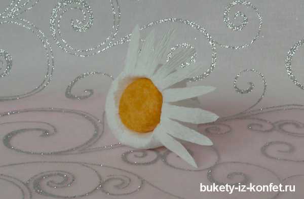 Предлагаю сделать вот такую ромашку для букета из конфет своими руками.