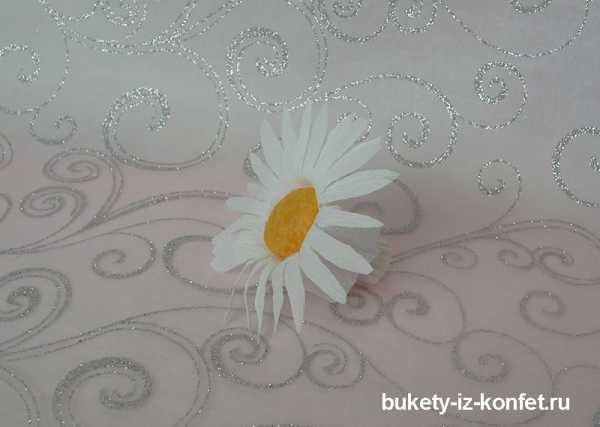 Далее требуется из гофрированной бумаги зелного цвета вырезать ленточку шириной 0,5 см, и по спирали наклеить е на проволоку. К этой проволоке прикрепляем конфетку(лучше, если она будет жлтого цвета). Следующий этап – прикрепляем лепесточки по кругу конфетки, крепим на клей. В итоге должна получиться вот такая ромашка: