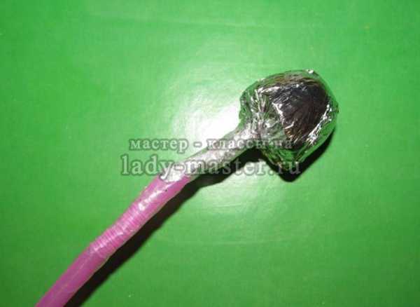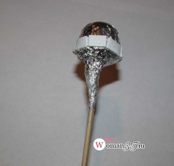 5. Возьмите конфету. Оберните ее фольгой, закрутив хвостиками от нее шпажку. Зафиксируйте все сверху скотчем. У основания конфеты наклейте двусторонний скотч.