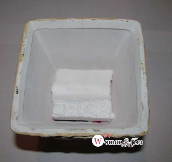 22. Возьмите для букета подходящий горшочек, вырежьте по его размеру кусок пенопласта высотой хотя бы от 3 см и с помощью двустороннего скотча закрепите его на дне емкости.
