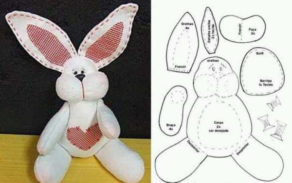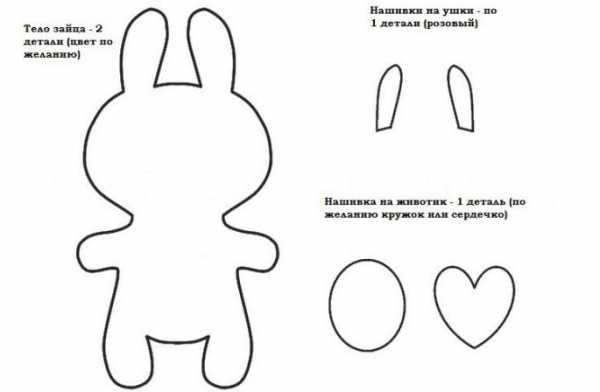 Зайчика сделать своими руками немного сложнее из-за большего количества мелких деталей. Помимо основы из белого фетра, нужно вырезать розовые щечки, такой же животик, белый хвостик и продолговатые розовые овалы для внутренней части ушек. Сначала приклейте или пришейте все детали к частям игрушки, нарисуйте глазки и носик, а только потом сшивайте основы вместе.