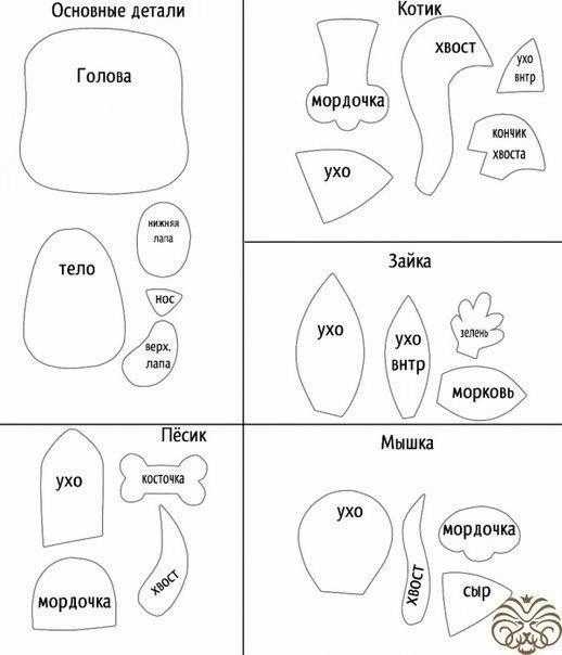 1. Выкройки всех игрушек состоят из основной детали и деталей лицевой части.