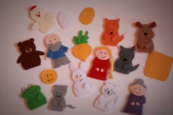 Выкройки пальчикового театра своими руками из фетра для сказки «Репка» можно нарисовать самостоятельно на основе изображений готовых игрушек. Но куклы для такого представления сделать сложнее, чем персонажей «Теремка» или Машу из сказки «Маша и три медведя», но можно выбрать варианты попроще. Всего нужно сделать семь игрушек: бабку и дедку, внучку, собачку и кошечку, мышку и, конечно, репку. Пальчиковые игрушки делаются по той же схеме, что и для других сказок: на основу прикрепляются детали, которые сделают узнаваемым того или иного героя. Например, косу для девочки, косынку и фартук для бабушки, бороду для дедушки. Репку тоже сделайте пальчиковой игрушкой – так показывать представление по сказке будет удобнее.